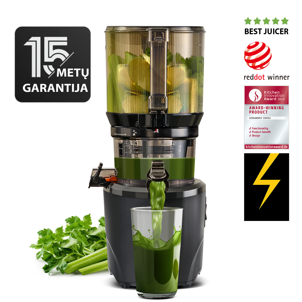 - Veikimas yra itin tylus, todėl yra tinkamas sultims spausti ryte