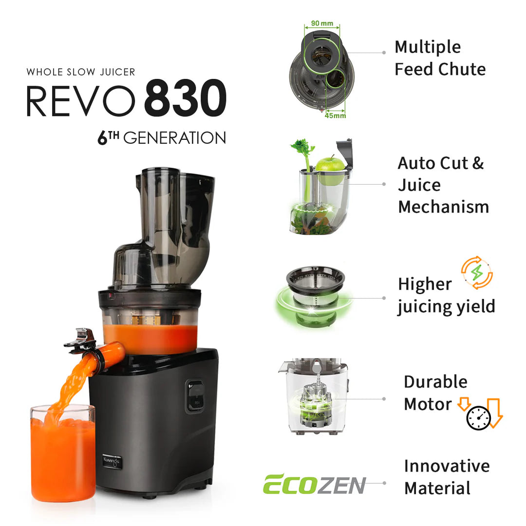 „REVO830“ lengvai susidoroja su visa morka, saliero stiebu ar agurku. Taip pat puikiai tinka ananasų juostelėms, lapiniams kopūstams ar špinatams.