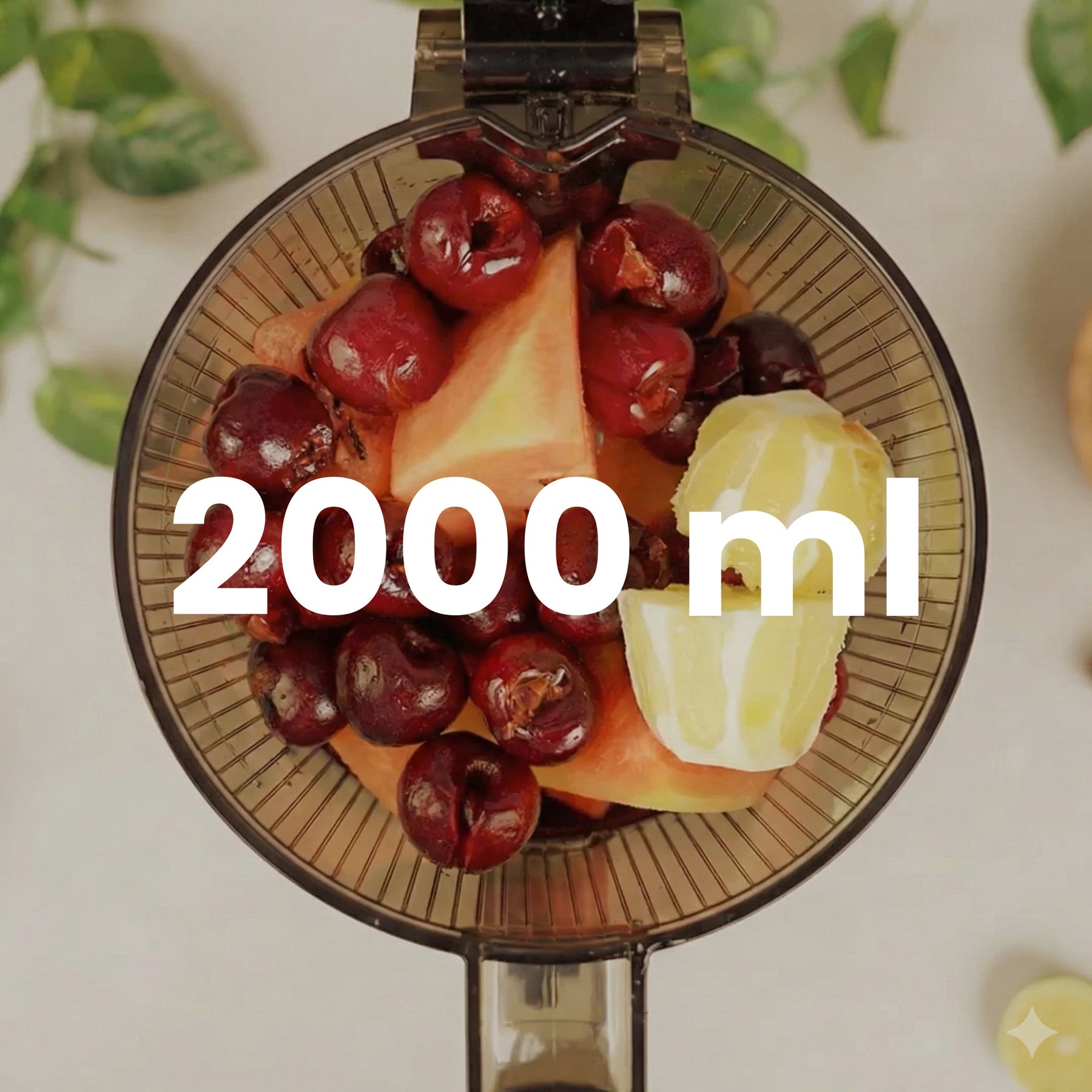 Didelė, net 2 000 ml talpa leidžia vienu metu apdoroti didelį kiekį ingredientų. Nereikia nuolat papildyti, todėl sulčių spaudimas tampa kur kas patogesnis ir efektyvesnis.