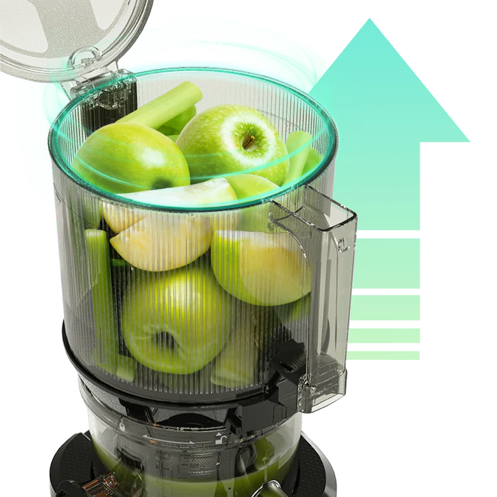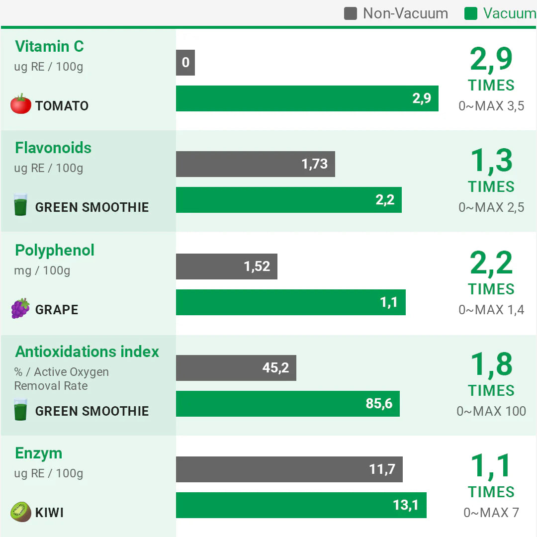 Vakuuminė technologija apsaugo nuo oksidacijos ir padeda išsaugoti maksimalų vitaminų bei maistinių medžiagų lygį, palyginti su greitaeigėmis centrifuginėmis sulčiaspaudėmis.