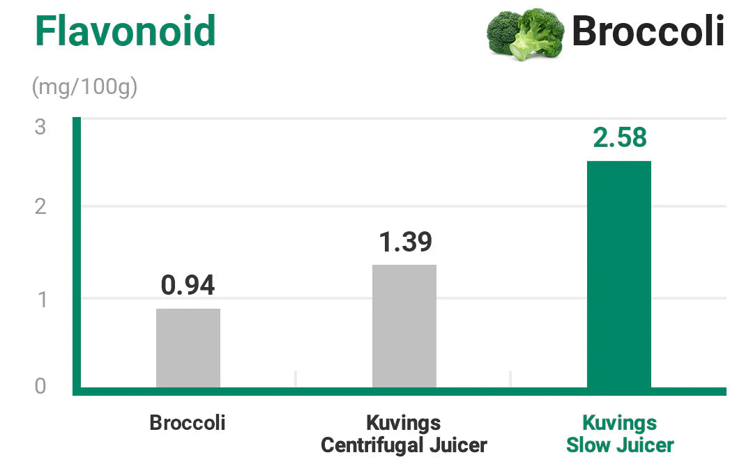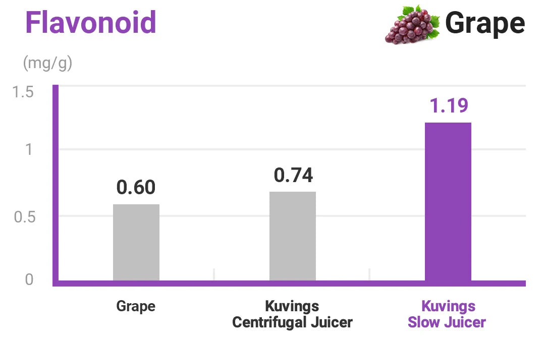 Flavonoidai: sultys iš lėtaeigės sulčiaspaudės turi 1,5 karto daugiau flavonoidų nei vaisiai ar sultys, išspaustos centrifugine sulčiaspaude.